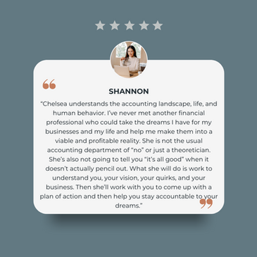 Open office hours with Chelsea Williams: This is where the bookkeeping service becomes something different. Once a month, you can bring your real questions - not "where did this transaction go" questions, but "why does this number look wrong to me" "what should I be paying attention to right now" questions. Chelsea answers them. You leave with more clarity than you arrived with.